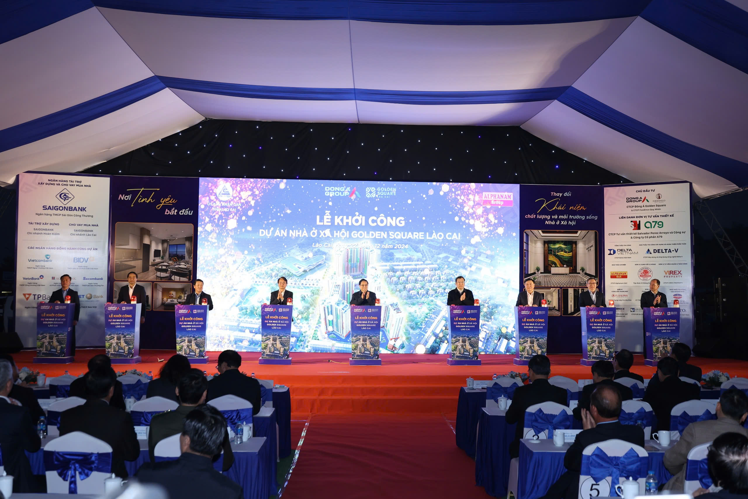 Tại buổi lễ, Thủ tướng Chính phủ Phạm Minh Chính cùng các đại biểu đã thực hiện nghi thức nhấn nút khởi công dự án nhà ở xã hội Golden Square Lào Cai.
